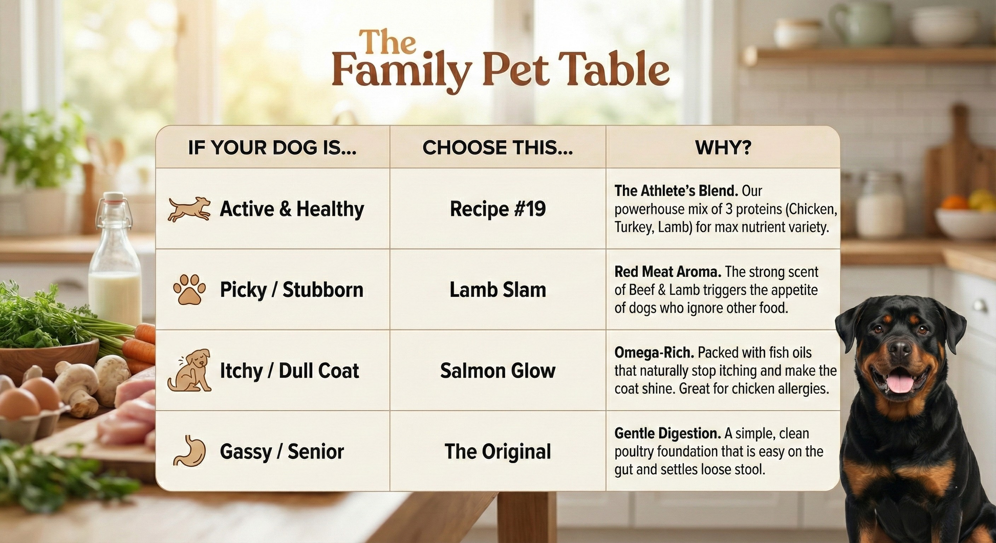 2. Choose Your Base Select the carbohydrate foundation (Rice & Lentils or Sweet Potato and Potato) that best fits your dog's digestion.